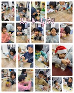 スノードームを作ろう!!ということで   みんなしっかり作り方の説明を聴きながら   作りました😊✌️   こぼさないように慎重に!!   力加減…