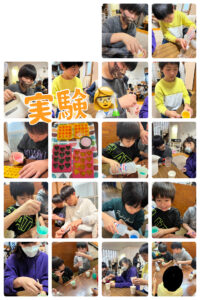 2グループに分かれて   実験開始‼️   こちらはスライム作り꒰ᐡ´т ‧̫ т ̀ ᐡ꒱🐾♡   線まで注ぐ!入れすぎずに慎重に♡   力加減…